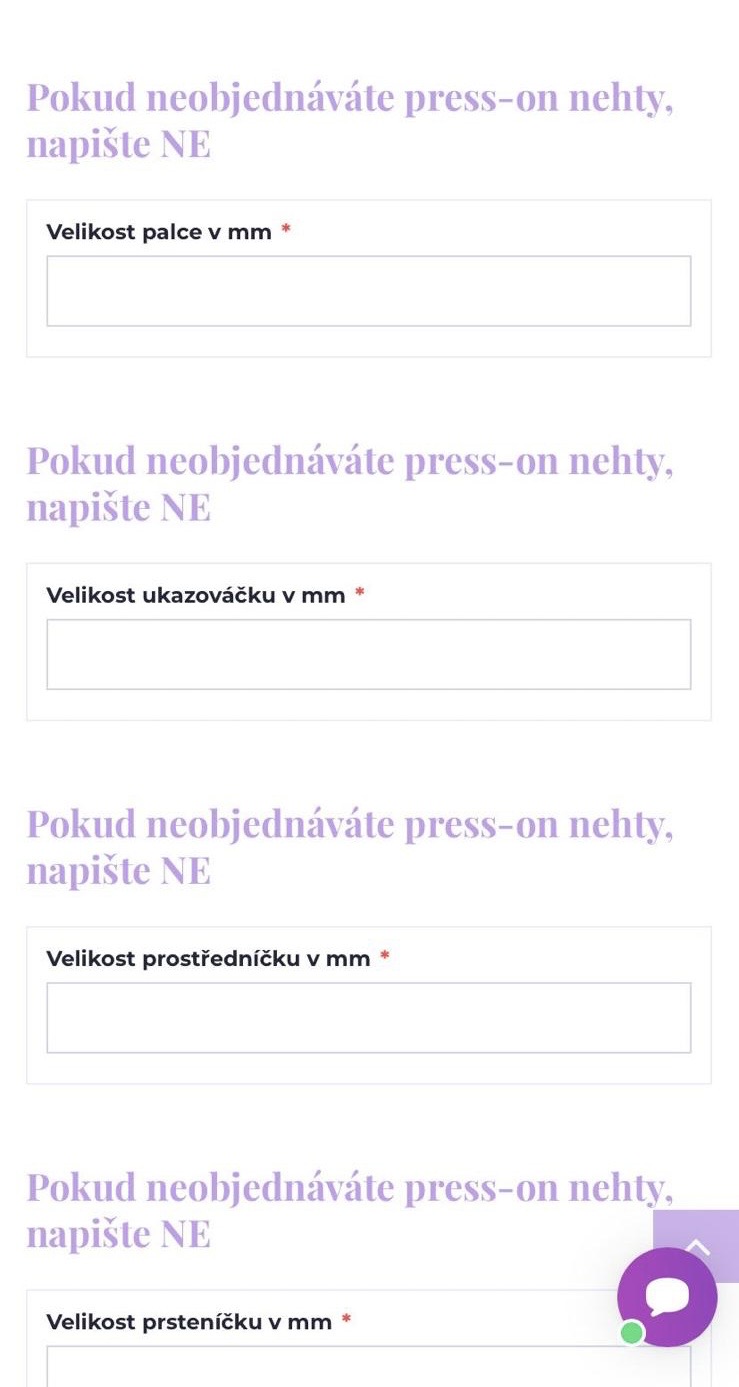 Jednotlivé velikosti nehtů zadáte po vložení produktu do košíku, volby dopravy a následně zvolení způsobu platby. Po těchto krocích se objeví Dodací údaje (Jméno, telefonní číslo atd.) v tomto kroku také naleznete kolonky k vyplnění jednotlivých velikostí.