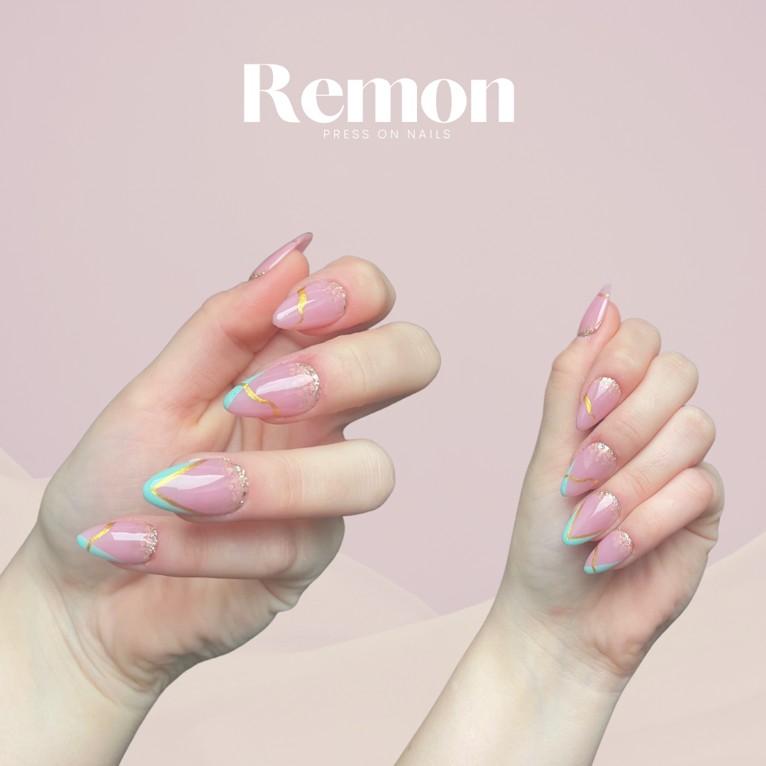Nehty INVERTED GLITTER + FRENCH na obrázku jsou ve tvaru Mandle S. Barvu vybíráte v roletce Barva designu 1 (na obrázku je to barva světle zelená)Barva designu 2 barva proužků (na obrázku barva Gold - zlatá) ukázka obrázek č. 3Barva třpitek bude sladěna s barevným proužkem.Design bude uzpůsoben vámi... celý popis